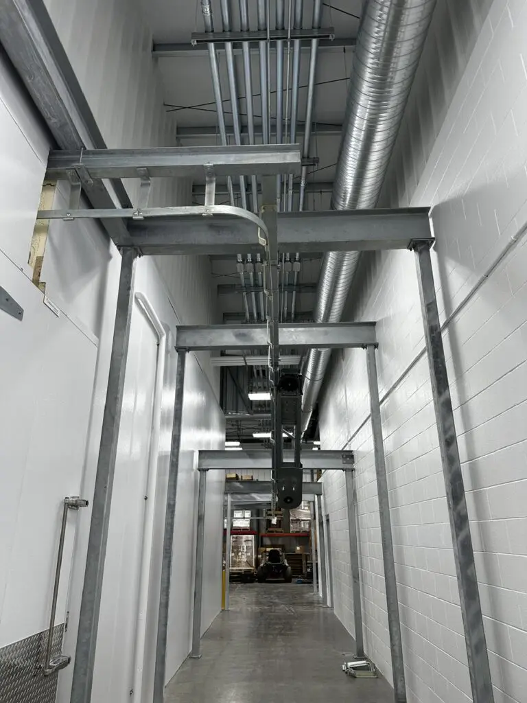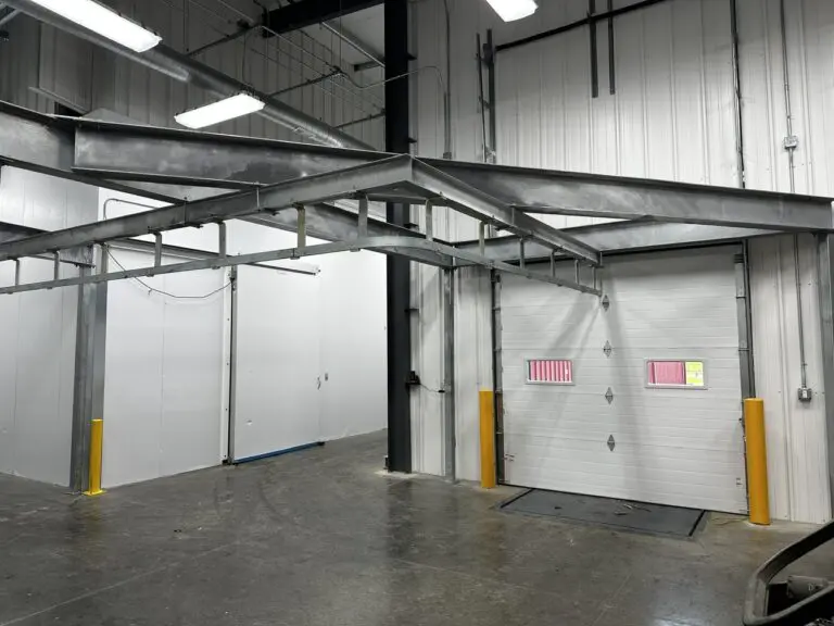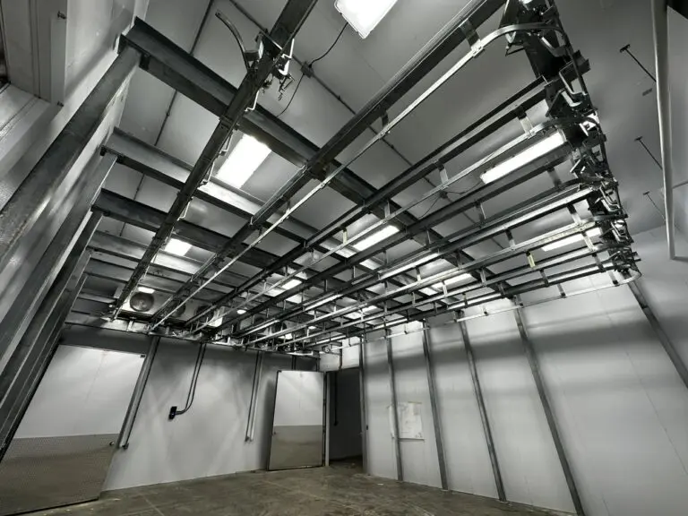 Completed in 2023, this build features several unique design elements to suit our client’s needs. It includes freezer and cooler boxes throughout the facility, a custom processing room, offices, bathrooms, locker rooms, washrooms, storage areas, and more. The facility is equipped with a full rail system that runs throughout the cooler boxes and process room, enabling the transportation of beef halves through the facility.